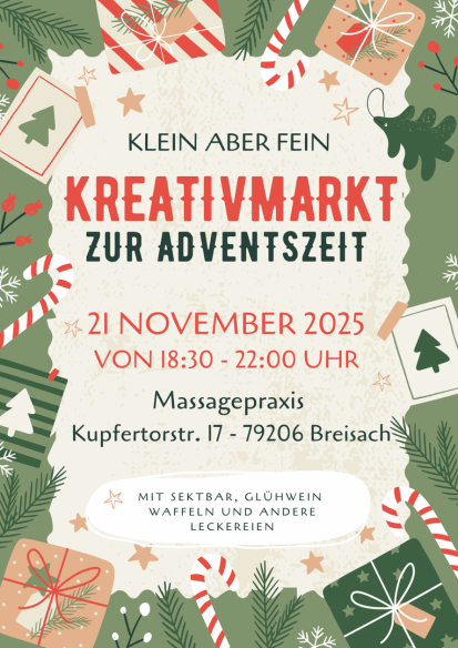 Am 21.11.2025 findet von 18:30 - 22:00 Uhr Uhr in den Praxisräumen ein kleiner Advents-Kreativmarkt statt.