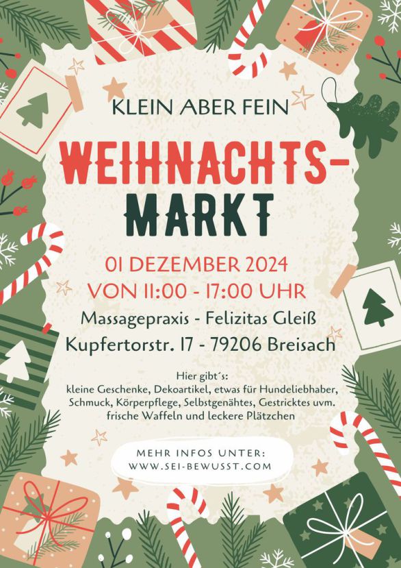 Am 21.11.2025 findet von 18:30 - 22:00 Uhr Uhr in den Praxisräumen ein kleiner Advents-Kreativmarkt statt.